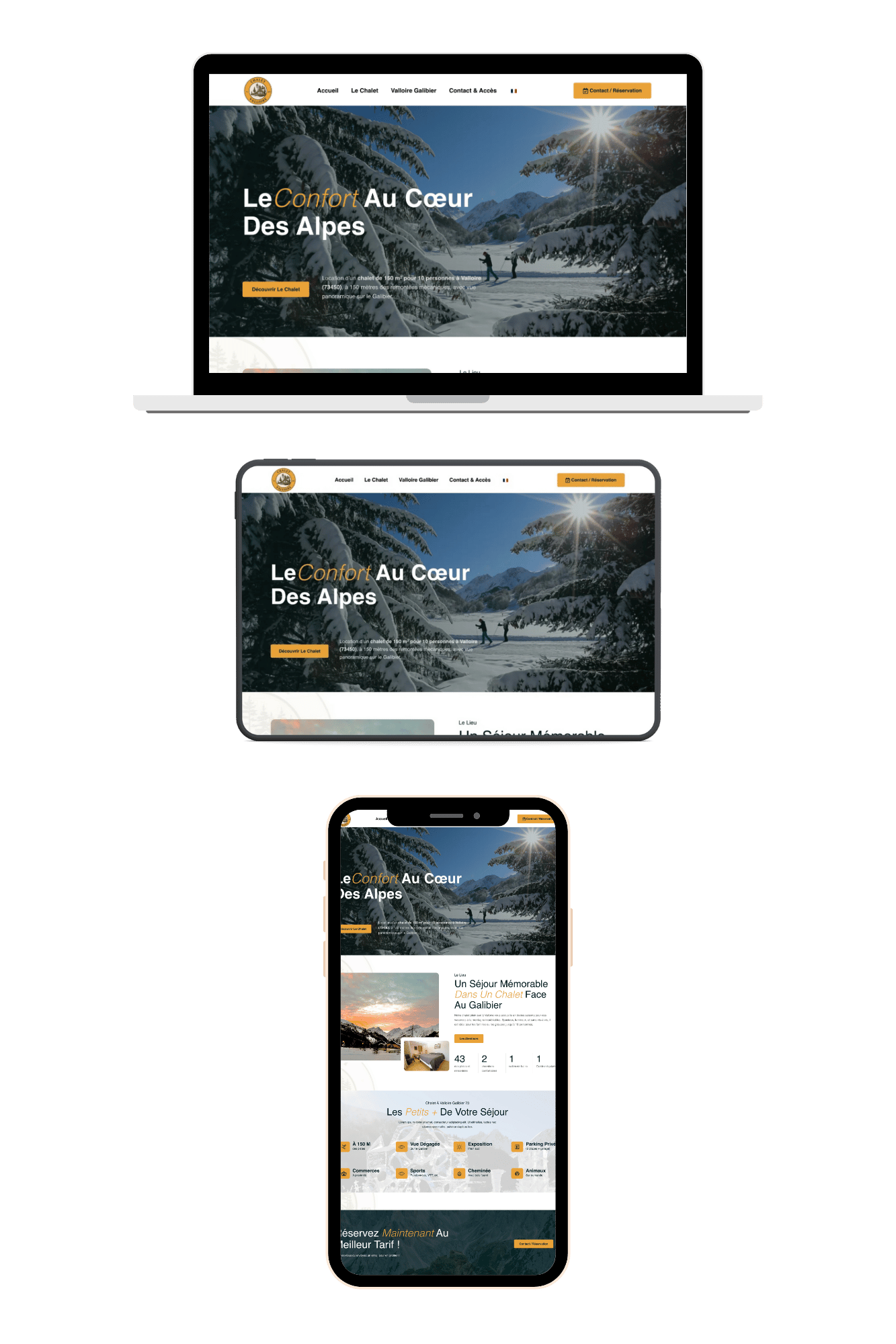 Dès la page d’accueil, des visuels panoramiques et une navigation intuitive mettent en avant le cadre montagnard et le confort du chalet.